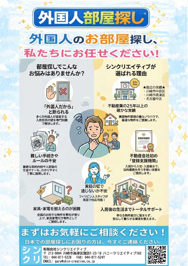 弊社は、不動産会社として外国人の方々に特化した居住用アパートのご紹介を行っております。